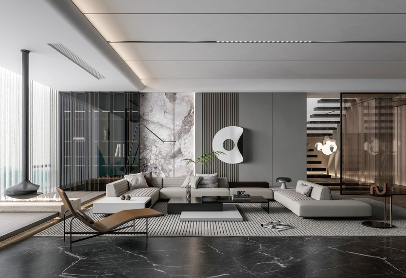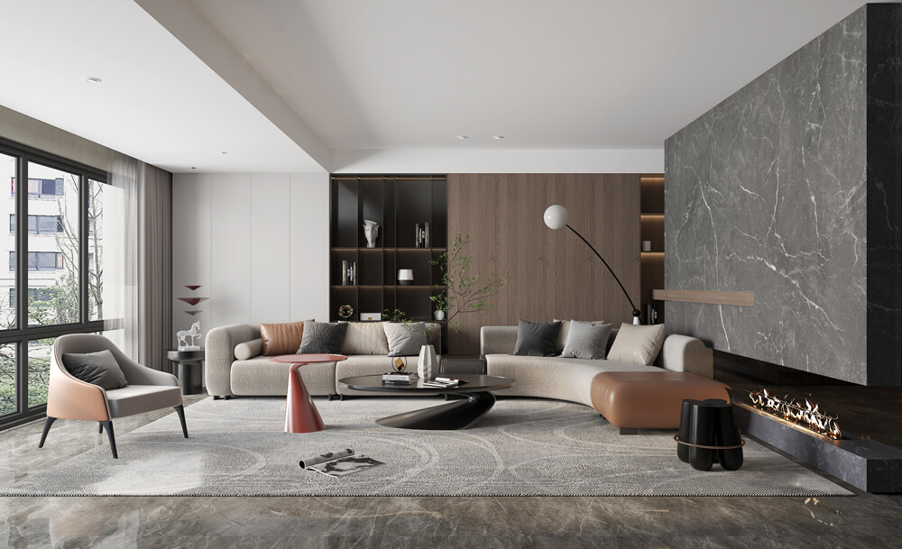 غرفة المعيشة لوح خزفي كبير الحجم ، هي واجهة المنزل، هي سيد الذوق ومتعة عرض الحياة، التصميم الداخلي الرمادي، نقي، طبيعي، كل تفاصيل العلاج، يمكن أن تشعر بجمال المساحة التي يجب جلبها.