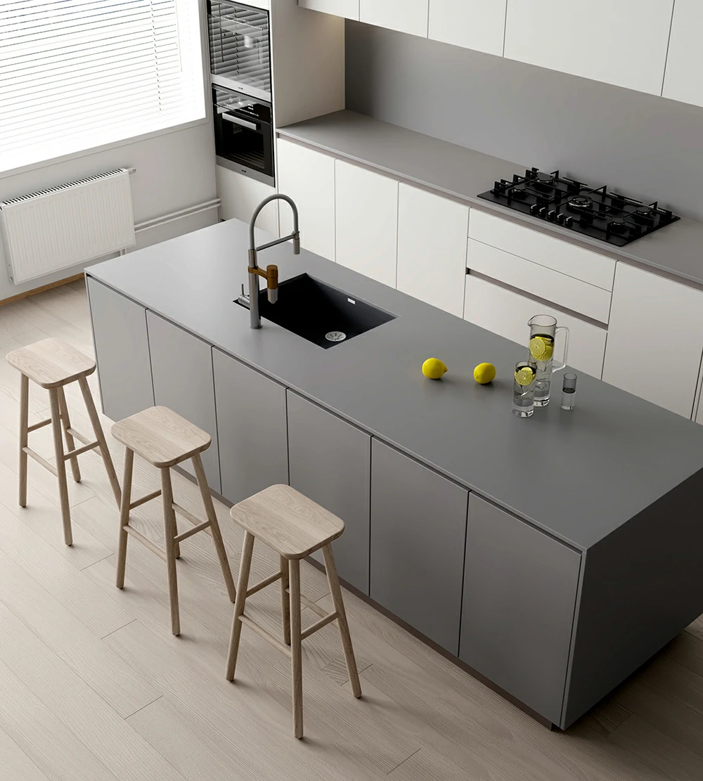 يفتح كونترتوب المطبخ الخزفي الكوارتز بالجملة ، مساحة داخلية مريحة، تطابق رمادي، توفر جوًا مريحًا وغير رسمي، مما يمنح شعورًا بسيطًا ودافئًا، مما يجعل الحياة تبدو أكثر جودة وعالية الجودة.