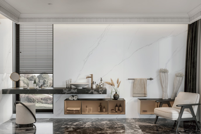 في مثل هذه المباراة، فمن المستحسن اختيار سطوع منخفض، نسيج غير لامع من اللون الأبيض موردي ألواح البورسلين لمسة رقيقة ولطيفة يمكن أن تسلط الضوء على جمال تفاصيل المساحة.